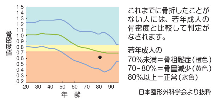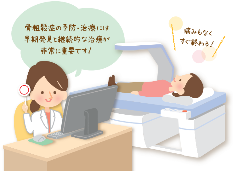 また、骨粗鬆症の予防・治療も重要な役割の一つです。骨粗鬆症とは骨がスカスカにもろくなる病気で、背骨や大腿骨などの骨折を引き起こしやすくなります。こうした骨折は寝たきりや要介護状態の大きな引き金になるため、早期発見と継続的な治療が非常に重要です。骨密度検査は、骨の強さを調べるために行う検査で、骨粗鬆症の診断や骨折リスクの評価に役立ちます。DEXA法と呼ばれるX線を用いた検査が一般的で、当院でもこの方法で行っており、腰椎や大腿骨の骨密度を測定します。痛みはなく短時間で終了し、放射線量もごくわずかです。定期的に検査を行うことで、骨の健康状態を把握し、生活習慣改善や薬物治療の効果を確認できます。特に閉経後の女性や高齢者では早めの受診が推奨されます。