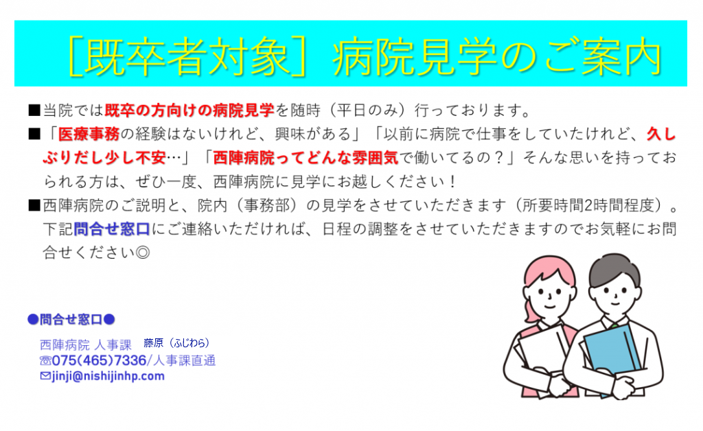 | 書類提出先 | 〒602-8319 京都市上京区五辻通六軒町西入溝前町1035 西陣病院 人事課 |